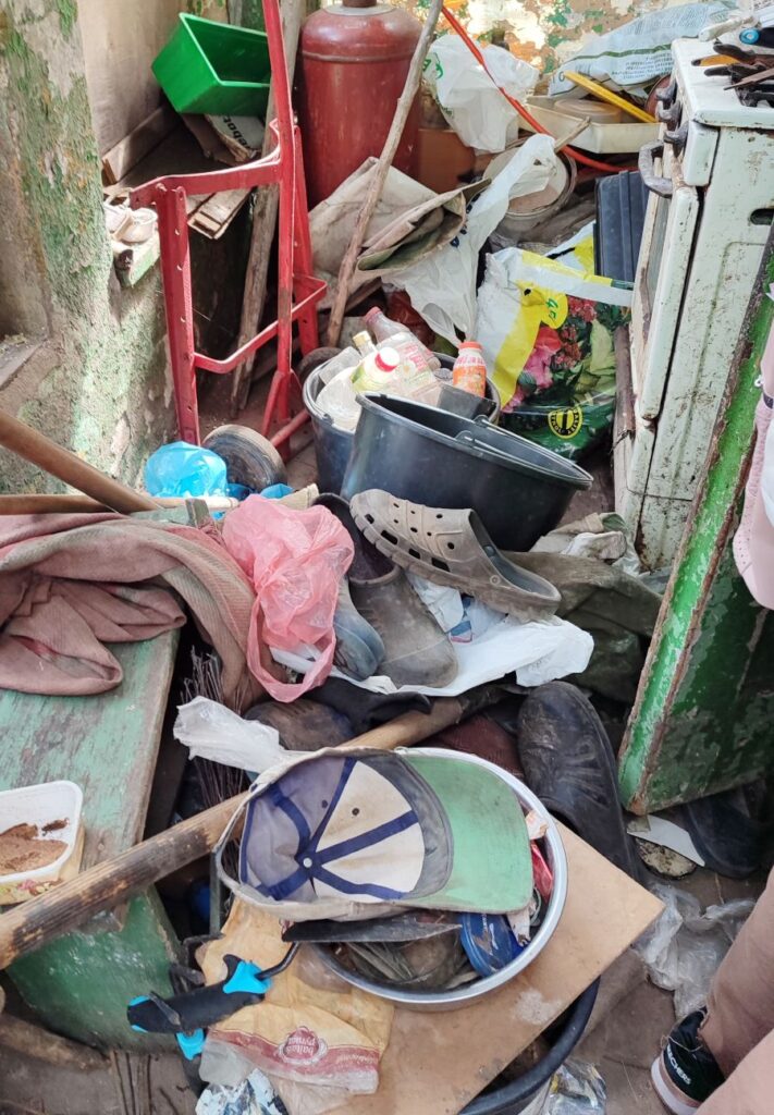 Socialinę darbuotoją Almą Pabrinkienę, pirmąsyk pravėrusią Juozo buto duris, pribloškė pamatytas vaizdas: stiprus tvaikas, kambariai iki lubų užkrauti įvairiausiais daiktais, per namus vedė du siauručiai takai iki lovos ir lango. Jokios galimybės išsimaudyti, skalbti ar pasigaminti šilto maisto.